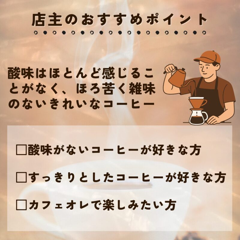 酸味はほとんど感じることがなくほろ苦く雑味のないきれいなコーヒーです。